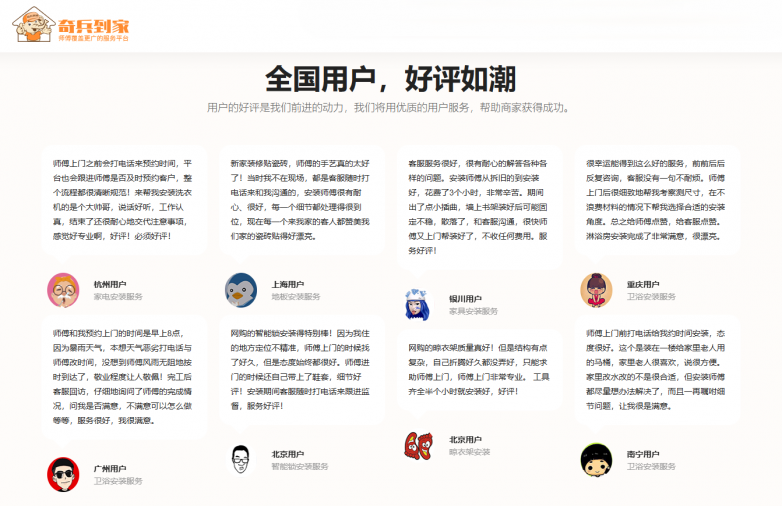 奇兵到家对师傅实行实名认证、技能考核、信用评价全流程管理,并承诺“一年质保,平台兜底”。每一笔服务可追溯、评价全公开,用确定性的保障打消客户顾虑。这不仅能显著降低投诉率与退货率,更能将优质服务转化为店铺好评与客户复购,构筑品牌信任护城河。
